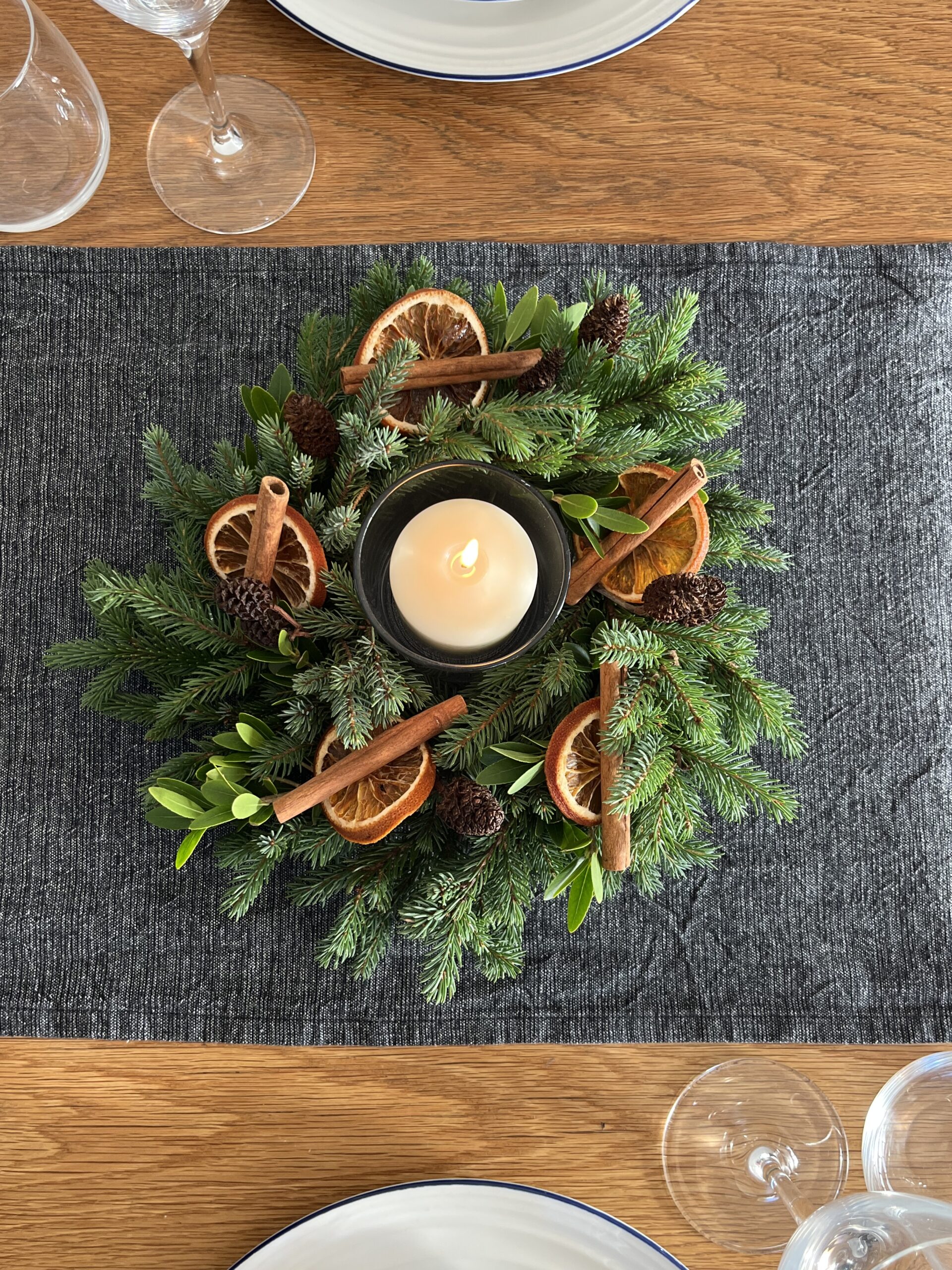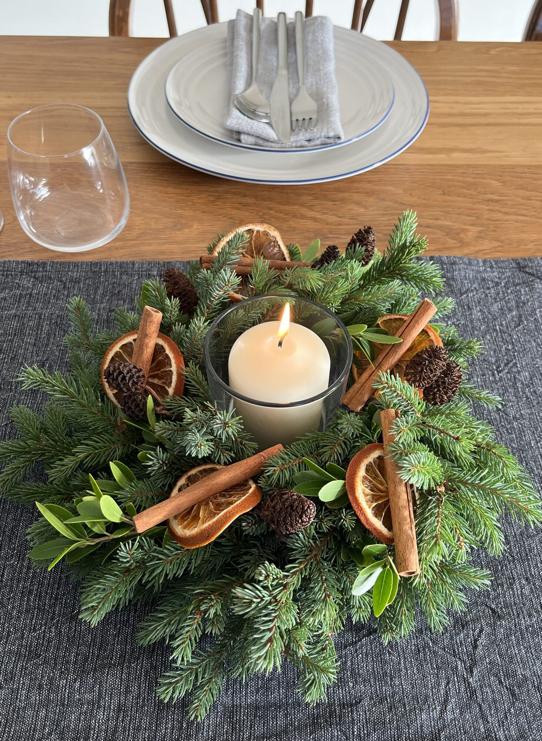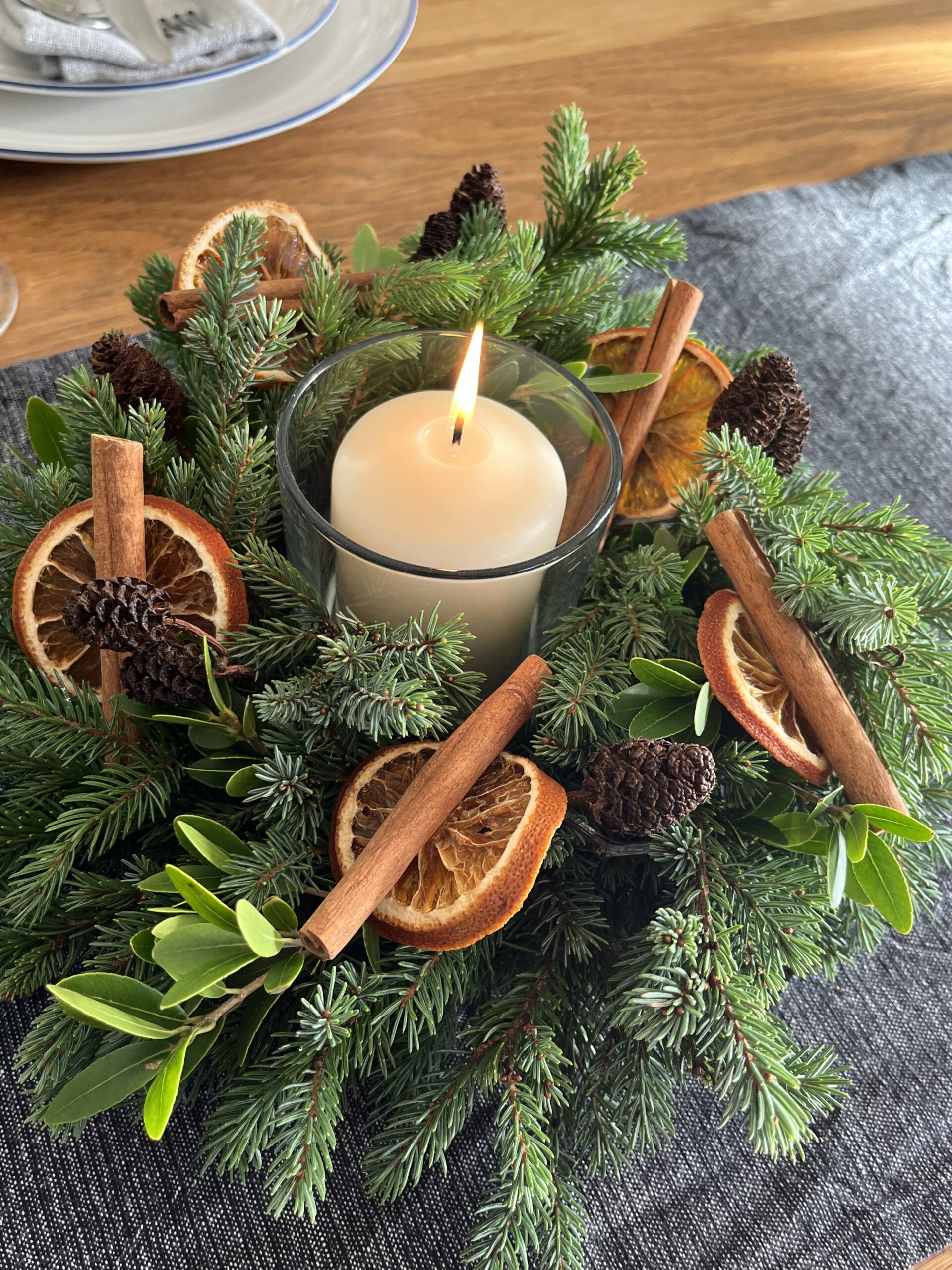 Luxury fresh centrepiece containing evergreen foliage, dried oranges, cinnamon sticks and miniature pine cones. Naturally foam-free.