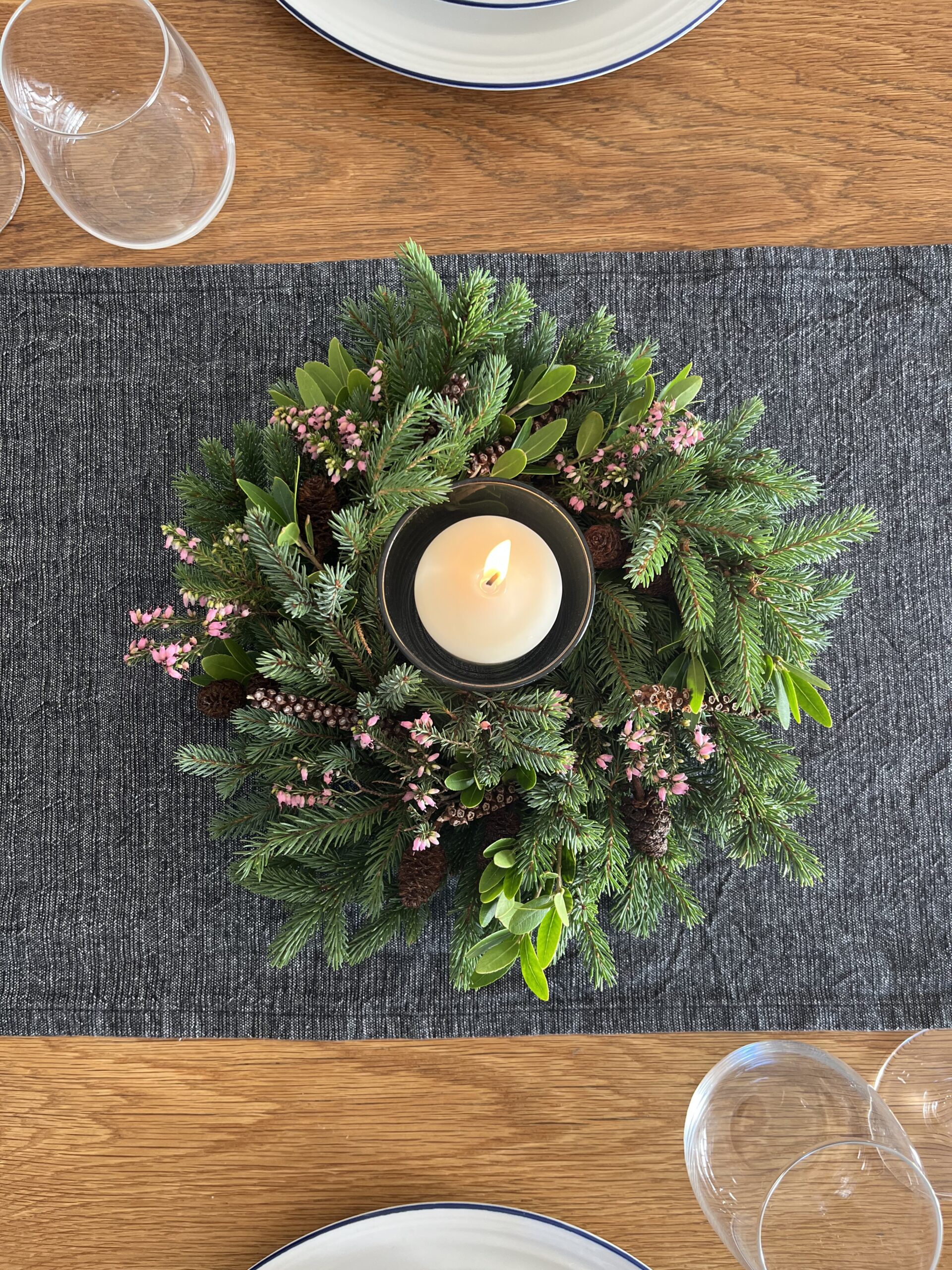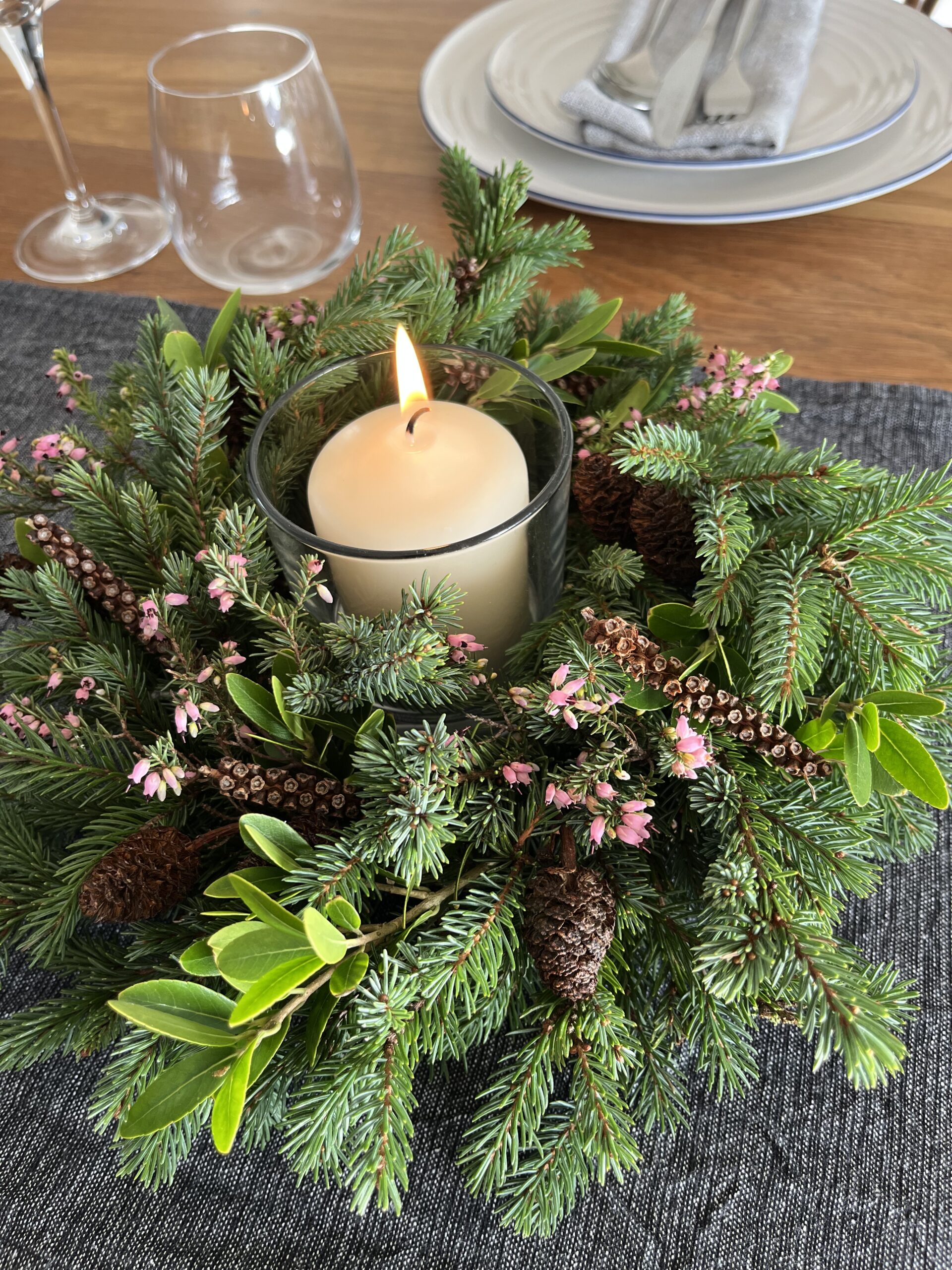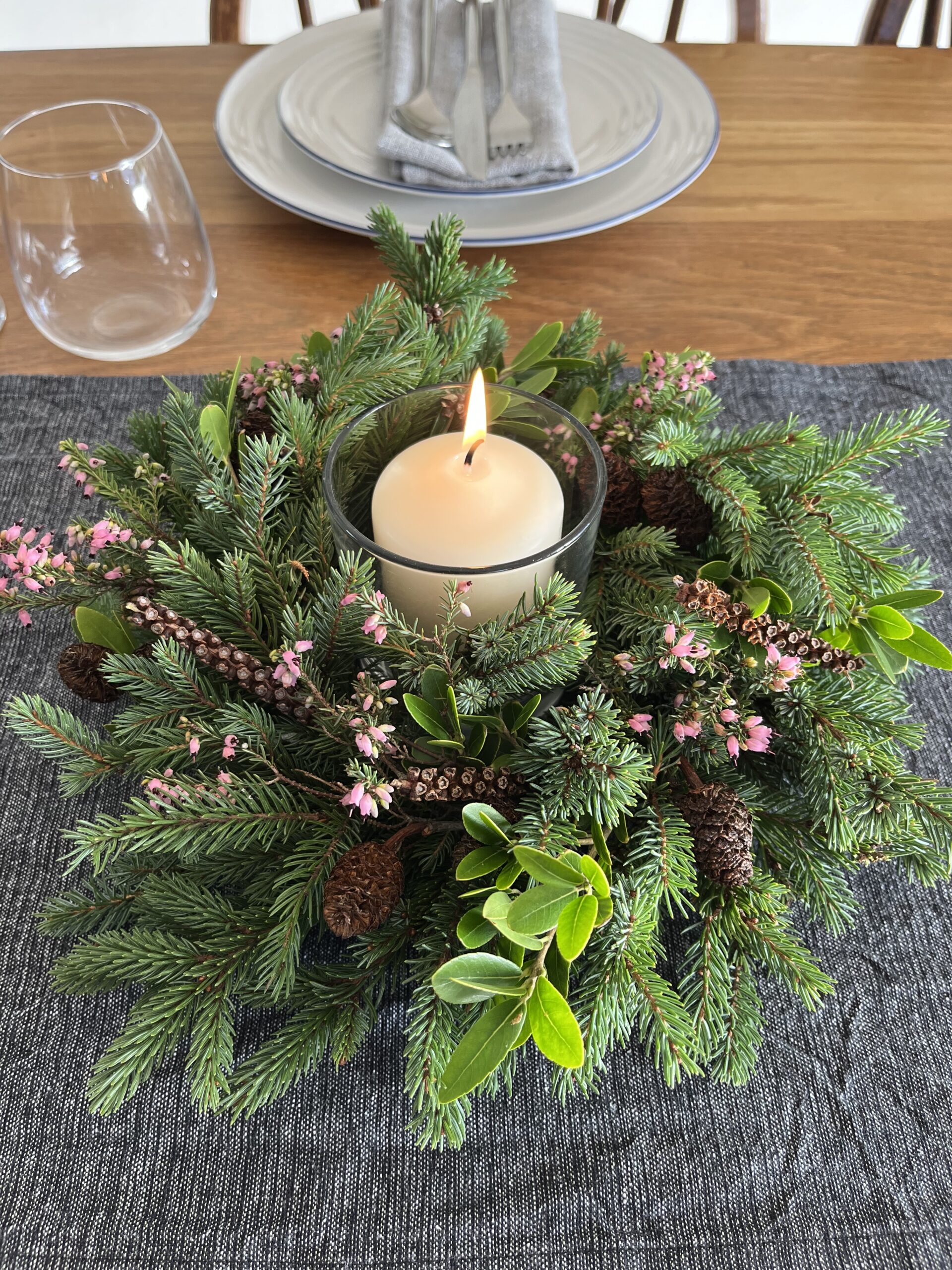 Luxury fresh centrepiece containing evergreen foliage, pink heather, miniature pine cones and seed heads. Naturally foam-free.