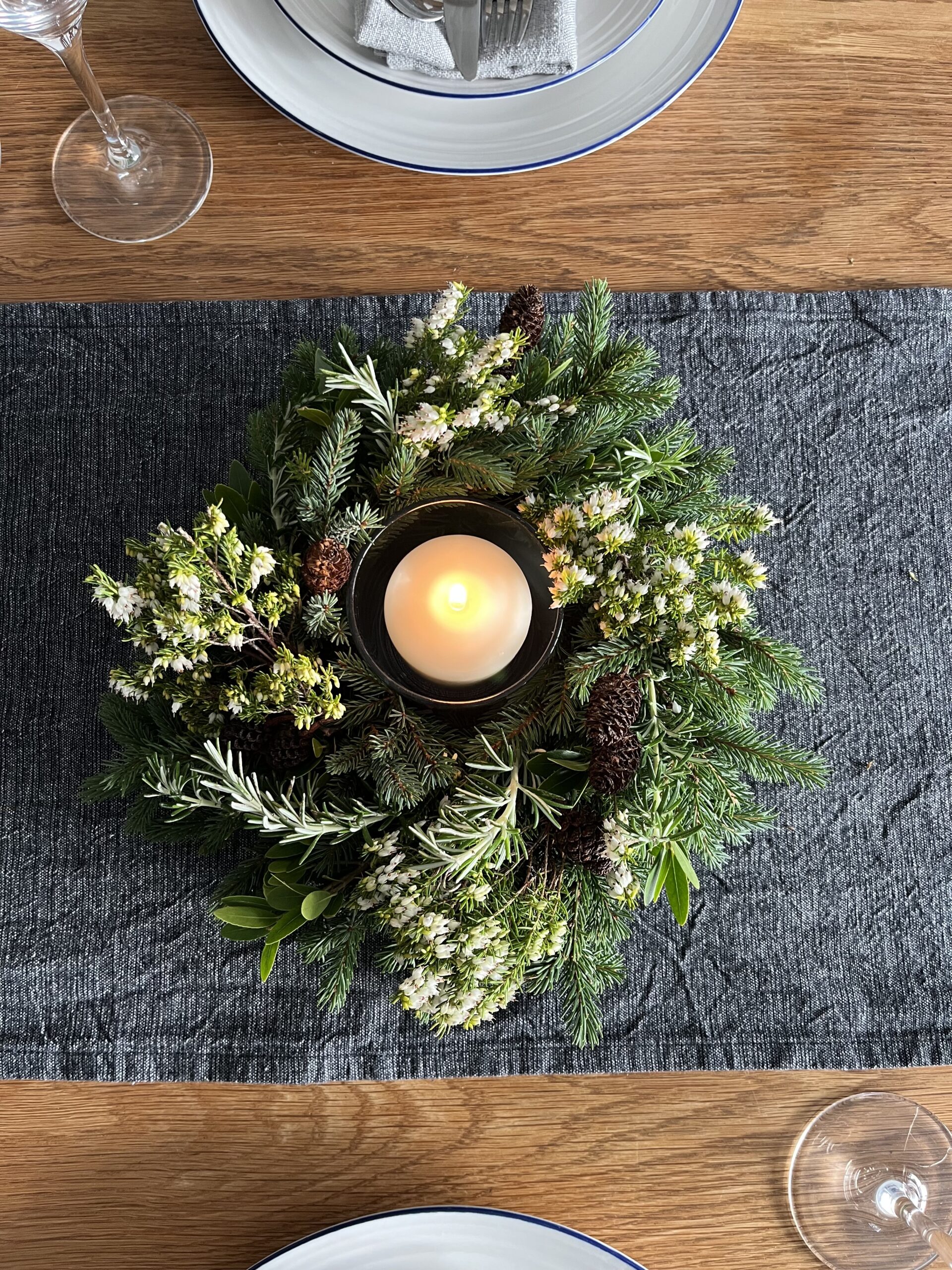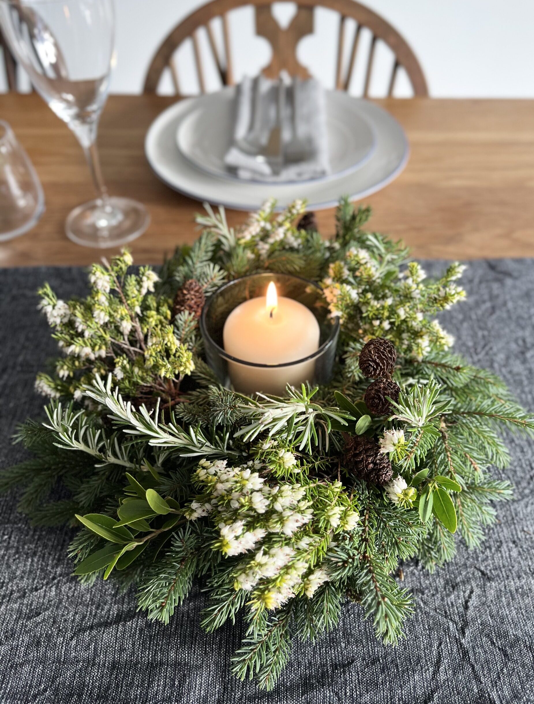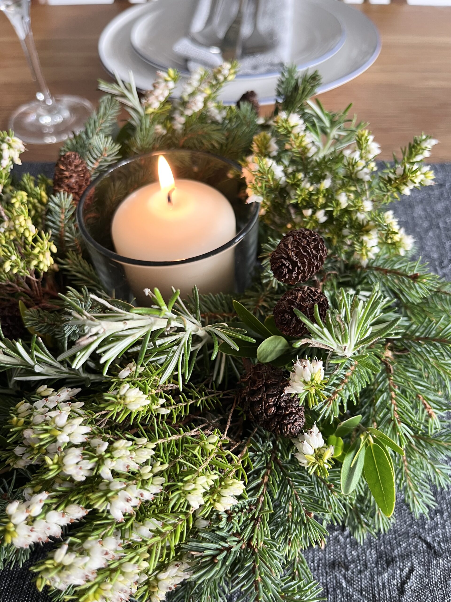 Luxury fresh centrepiece containing evergreen foliage, rosemary sprigs, white heather and miniature pine cones. Naturally foam-free.